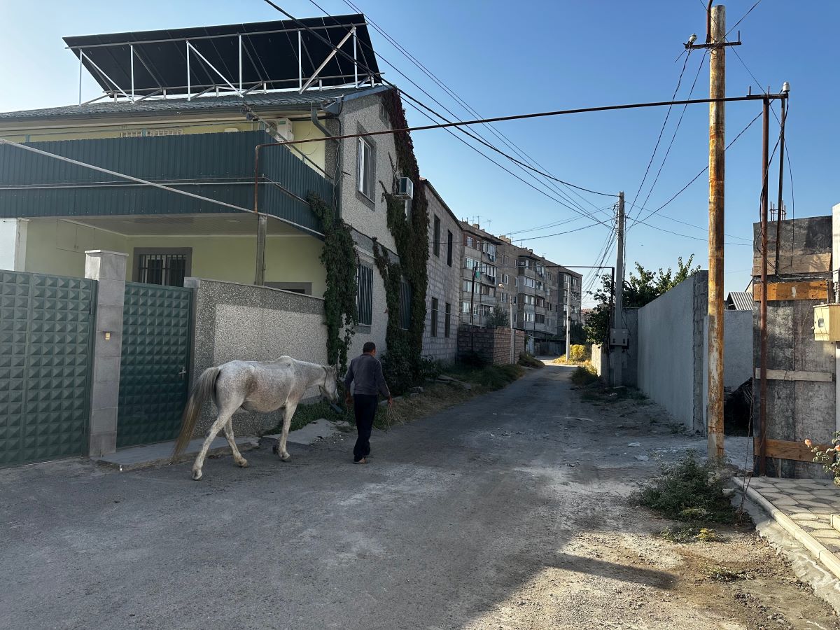 Փոշոտ բակում կապույտ ու շականակագույն խալաթներով երիտասարդներ են ծխում: Բուժվող զինվորներ են հավանաբար: Նույն բակում լվացք է փռած, երեխաներ են խաղում, սա էլ արցախցիների նոր կենցաղն է: Մի մասնաշենքը գործող հիվանդանոցն է, մյուսը` արցախցիների կացարաններ:
