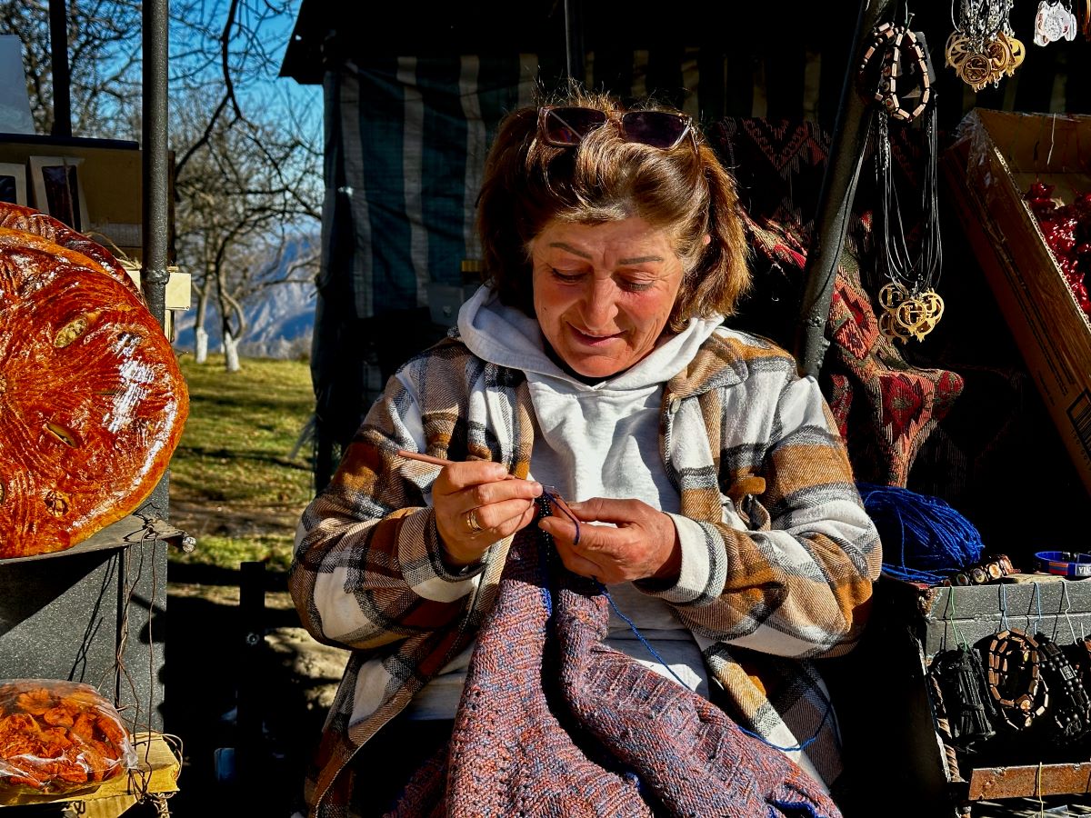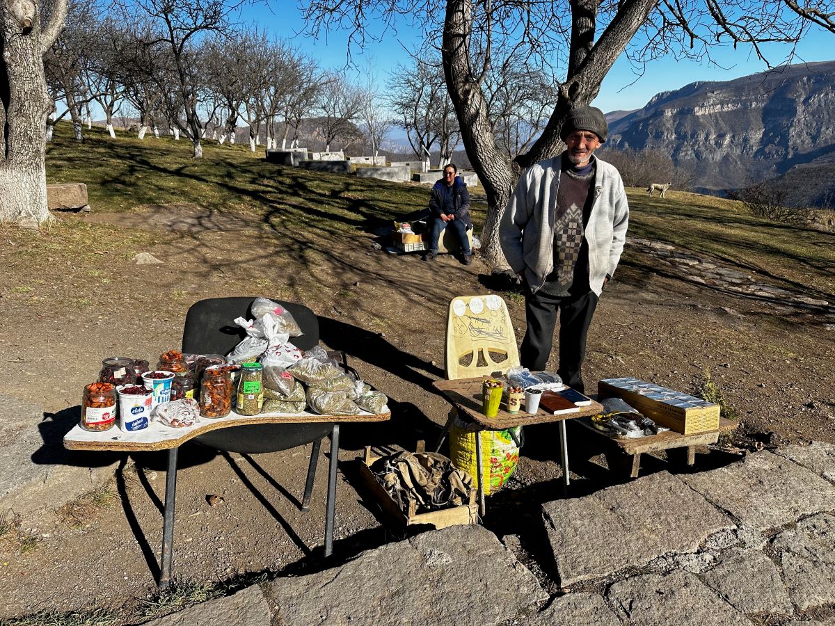 Իմանալով, որ ես զբոսաշրջիկ չեմ, կինն ինձ գնումներ անել չառաջարկեց, խորհուրդ տալով Դիմոյի (Դմիտրի) հետ ծանոթանալ, ով գրեթե նույն իրերն է վաճառում, բայց նրա տաղավարն ավելի աղքատիկ է, քան «մրցակիցներինը»։ Ես Դիմոյին ճանաչում եմ մանկուց. նա տատիկիս հարևանն էր մեր գյուղում՝ Արցախում։ Հիմա նա հավաքում է այն, ինչ բնությունը տալիս է Տաթևի շրջակա անտառներից, և վաճառում եկեղեցու մոտ։ Ասում է, որ այս սեզոնին հազիվ 1000 դրամ է վաստակում օրական և սպասում է զբոսաշրջիկների սեզոնի բացմանը։