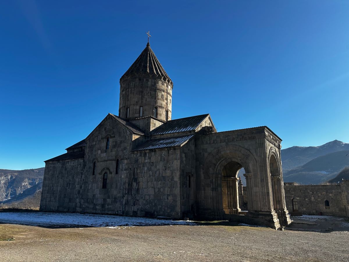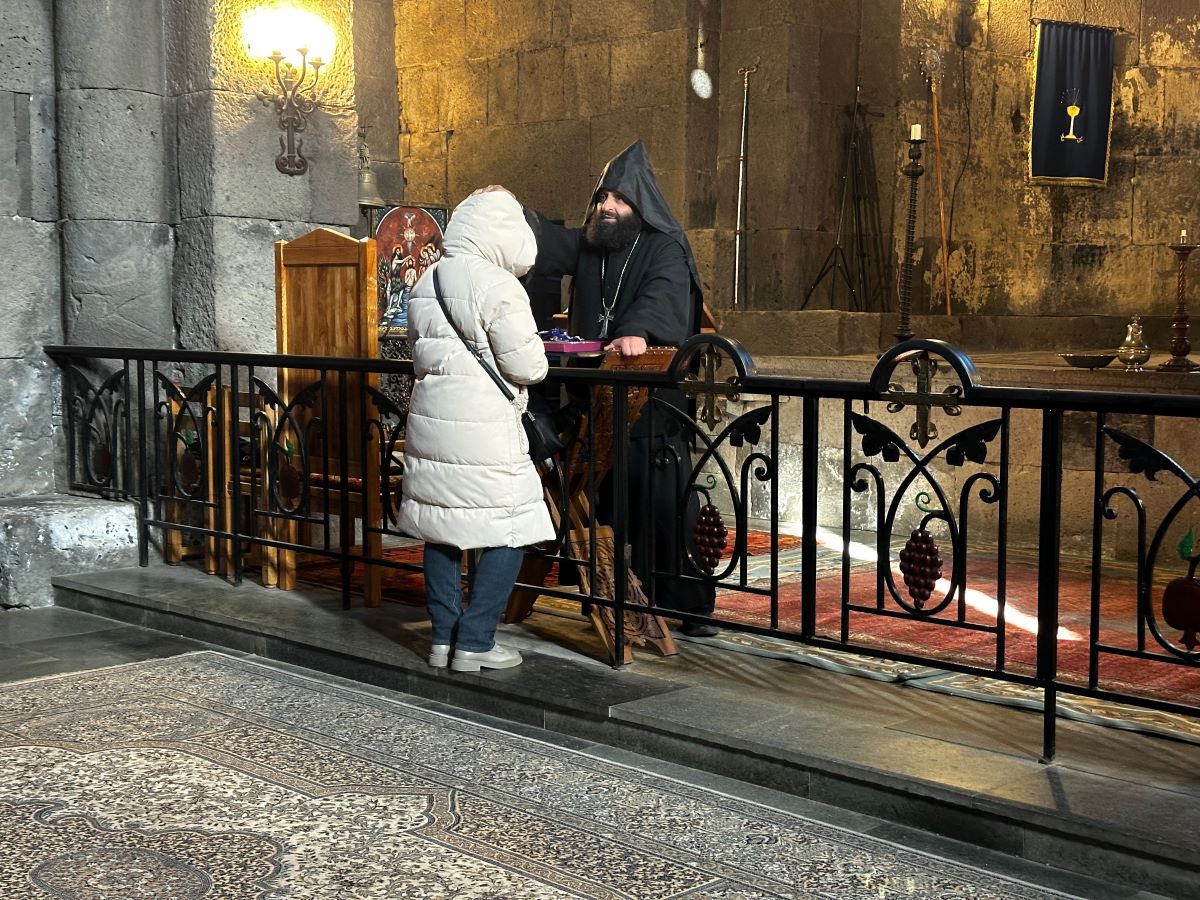 Կիրակի առավոտյան Տաթևի վանքում մի կին քահանայից օրհնություն է ստանում, պատերն արձագանքում են «Սուրբ-Սուրբը», ինչ-որ մեկը որդու հետ եկել է մոմ վառելու։ Ձմռան կապույտ երկքով անցնում է ճոպանուղին, որը միանգամից Ռուբեն Վարդանյանի մասին է հիշեցնում եւ որ գներն անհասանելի են դարձել տեղացիների համար` 9,000 դրամ: Եկեղեցու հարեւանությամբ չրեր, ուրցի, մասուրի թեյեր, գործված խաղալիքներ ու տարբեր հուշանվերներ են վաճառում տեղացիները։ Նրանցից մեկը քահանայի բրդյա կամ բամբակյա ժիլետն է հյուսում-վերանորոգում։ Քահանան այն նետել չի ցանկացել, քանի որ նվեր է, և խնդրել է այս կնոջը վերանորոգել այն։