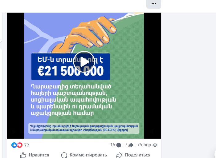 Մոտ 750,000 մարդ դիտել է Հայաստանում ԵՄ պատվիրակության Ֆեյսբուքյան էջում տեղադրված նութերն առ այն, որ ԵՄ-ն վերջին երեք տարիների ընթացքում 78 միլիոն եվրոյի օգնություն է տրամադրել Լեռնային Ղարաբաղից տեղահանված հայերին: Ակնհայտ է, որ այն դիտել են ոչ միայն 150,000 ղարաբաղցիներ, այլ հինգ անգամ ավելի շատ մարդիկ, ինչը ռեկորդային թիվ է նույն կայքում տեղադրված այլ տեղեկատվության համեմատ։