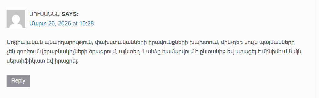 «Բնակապահովման ծրագիրը սխալ սկզբունքով է կազմված։ Բնակարանի ձեռք բերման գումարը պետք է հատկացնեն ընտանիքին, ոչ թե մարդուն։ Մեծ կազմով ընտանիքները և՛ տուն են առնում, և՛ կահույք, իսկ փոքր թվով ընտանիքները պետք է ամբողջ կյանքում անտուն մնան, կամ վարկի տակ մտնեն։ Իսկ փոքր ընտանիքներին վերաբերող նոր ծրագիրը հարմար է միայն թոշակառուներին։ Անչափահաս երեխա ունեցող կամ երիտասարդ փոքր ընտանիքների համար այլ ծրագիր պետք է մշակել»,- նշում է օգտատեր Արմիդա Աբրահամյանը։