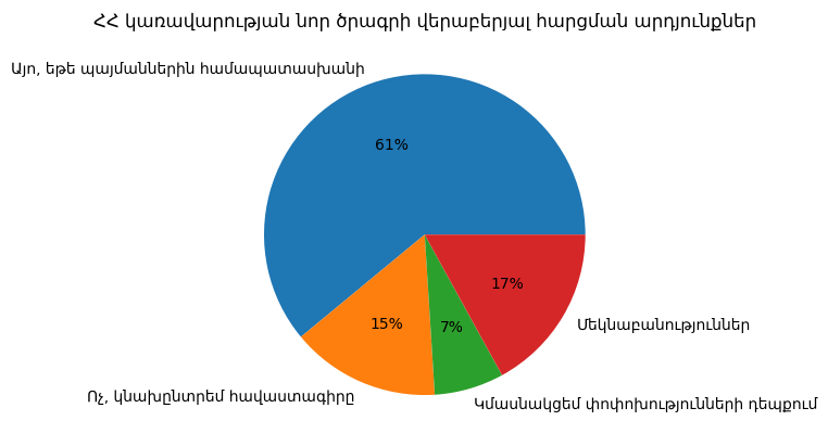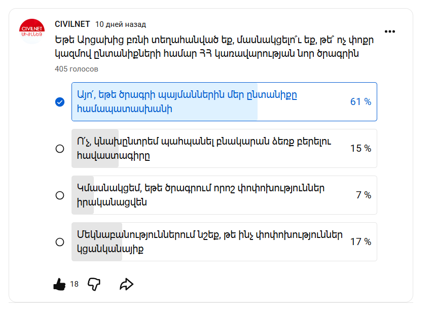 На вопрос: «Будете ли вы участвовать в новой программе правительства Республики Армения для малых семей?», 405 пользователей ответили: