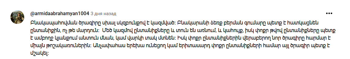 «Программа жилищной помощи выстроена по неправильному принципу. Деньги на покупку квартиры должны выделяться семье, а не человеку. Большие семьи покупают и дом, и мебель, а малочисленные вынуждены оставаться бездомными до конца жизни или влезать в долги. А новая программа для малых семей подходит только пенсионерам. Для малых семей с несовершеннолетними детьми и молодежи следует разработать другую программу», — отмечает пользователь Армида Абрамян.