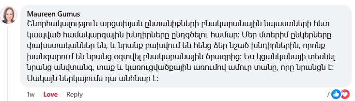 Также прозвучало следующее мнение: «Спасибо за то, что обратили внимание на системные проблемы с жилищными пособиями для семей из Арцаха. Наши близкие друзья — беженцы, и они сталкиваются именно с теми проблемами, которые вы упомянули и которые мешают им получить доступ к жилищной программе. Я хотела бы видеть их в безопасном, теплом и надежном доме, который был бы их собственным. Но в настоящее время это невозможно», — Морин Гумус.