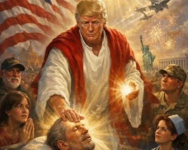Дональд Трамп в своей соцсети Truth Social опубликовал собственное изображение, на котором предстал в роли целителя. На заднем фоне видны символы США — флаг, статуя Свободы и орел. В небе летят военные самолеты.